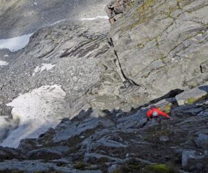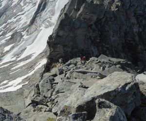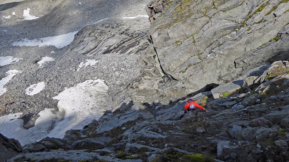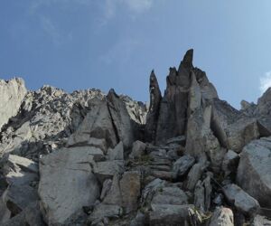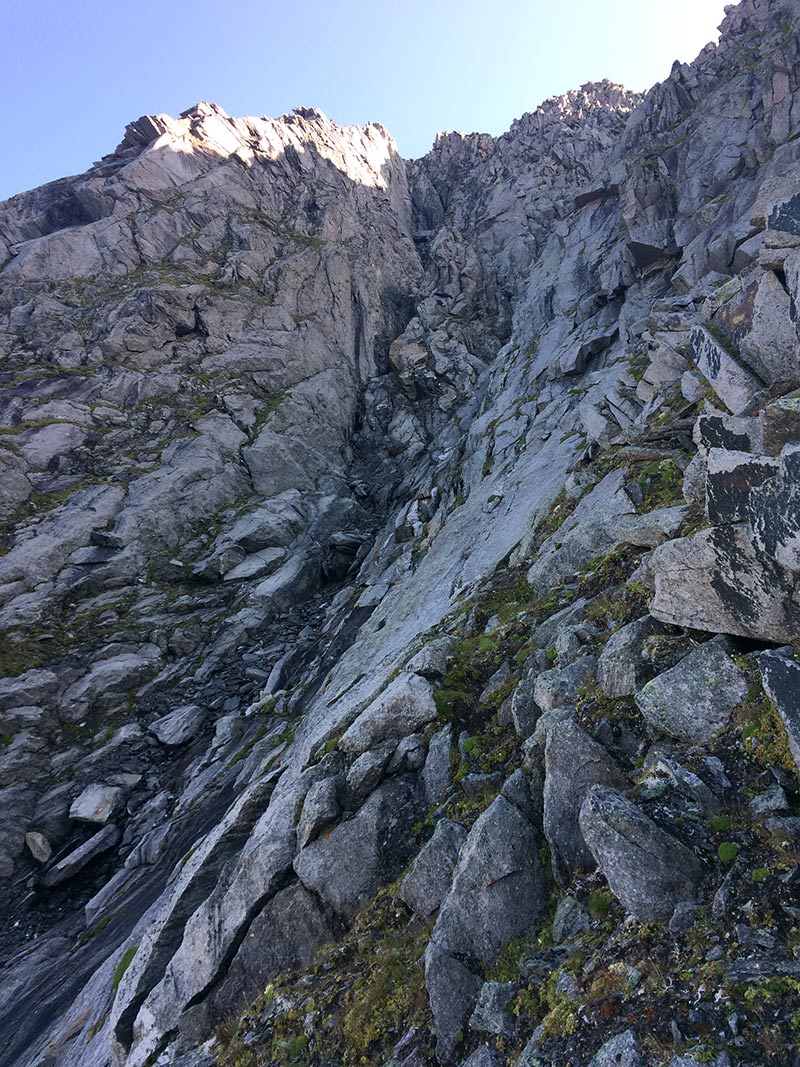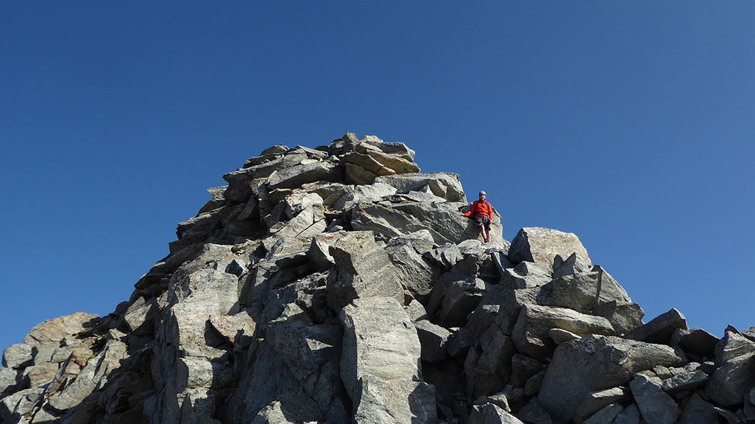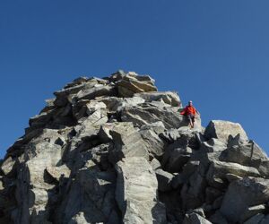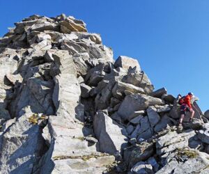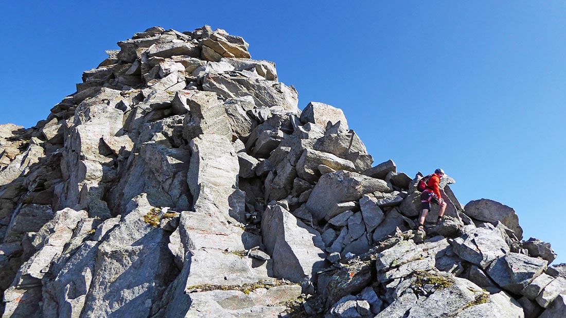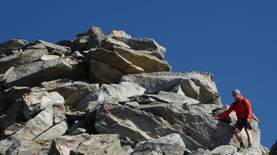 Ab hier noch ein kurzer Aufschwung der Seilversichert ist (Schlüsselstelle C) anschliessend in einfacher Blockkletterei meist im I Schwierigkeitsgrat auf den Gipfel (1 bis 2 Stellen vielleicht II)