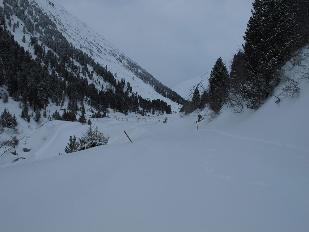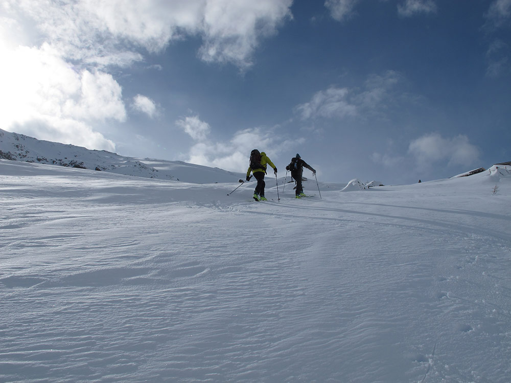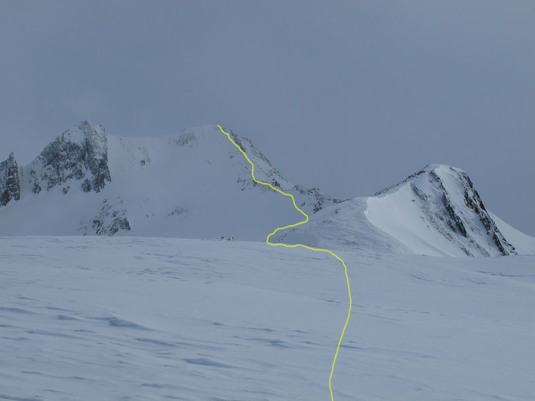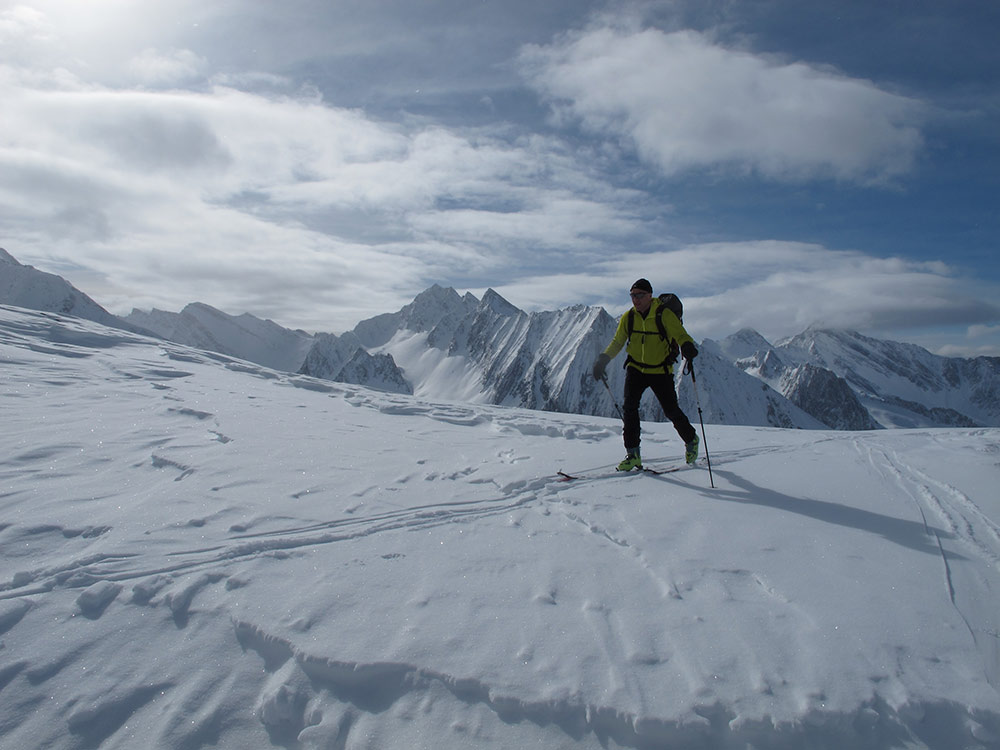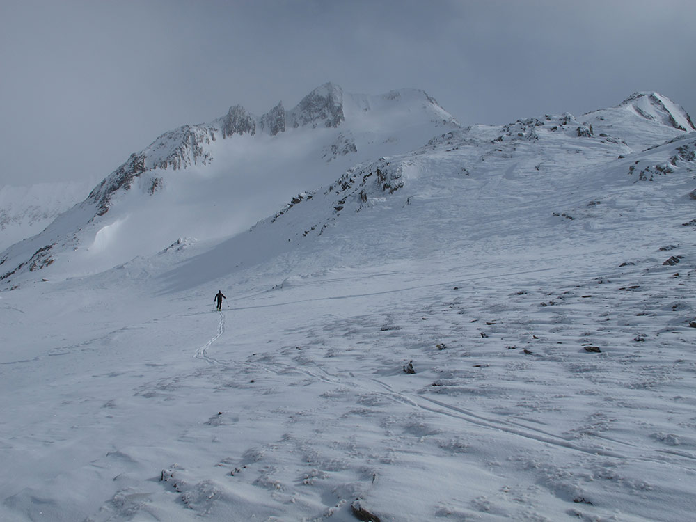 1. Man durchquert den grossen Talboden und steigt wie im Sommer in Richtung Pfitscherjochhaus auf, hier kann man dann im Bereich der Zollhütte nach links schwenken und dann in Richtung Gipfel aufsteigen, es finden sich immer mässig steile Hänge für einen sicheren Aufstieg bis unter den Gipfelhang, bei guten Verhätnissen kann der steile Gipfelaufbau direkt mit Schi gemacht werden, anonsten muss zu Fuß über den Grat augesteigen werden. Achtung das letzte Stück muss durch die Flanke gestapft werden, hier kann man nicht auf den Grat ausweichen.