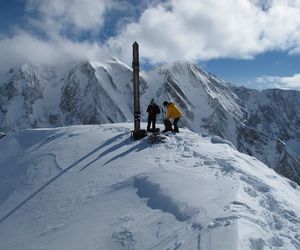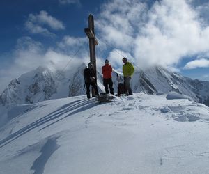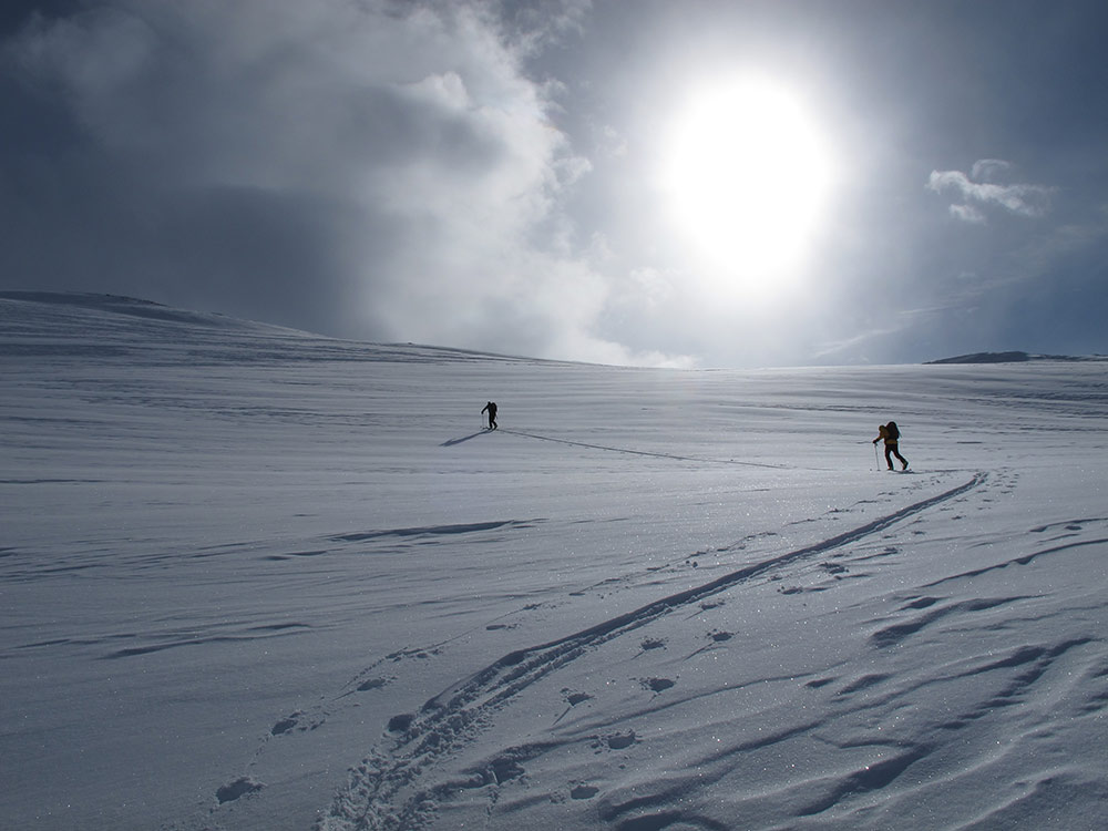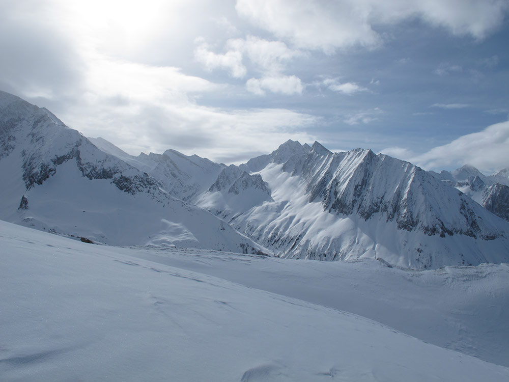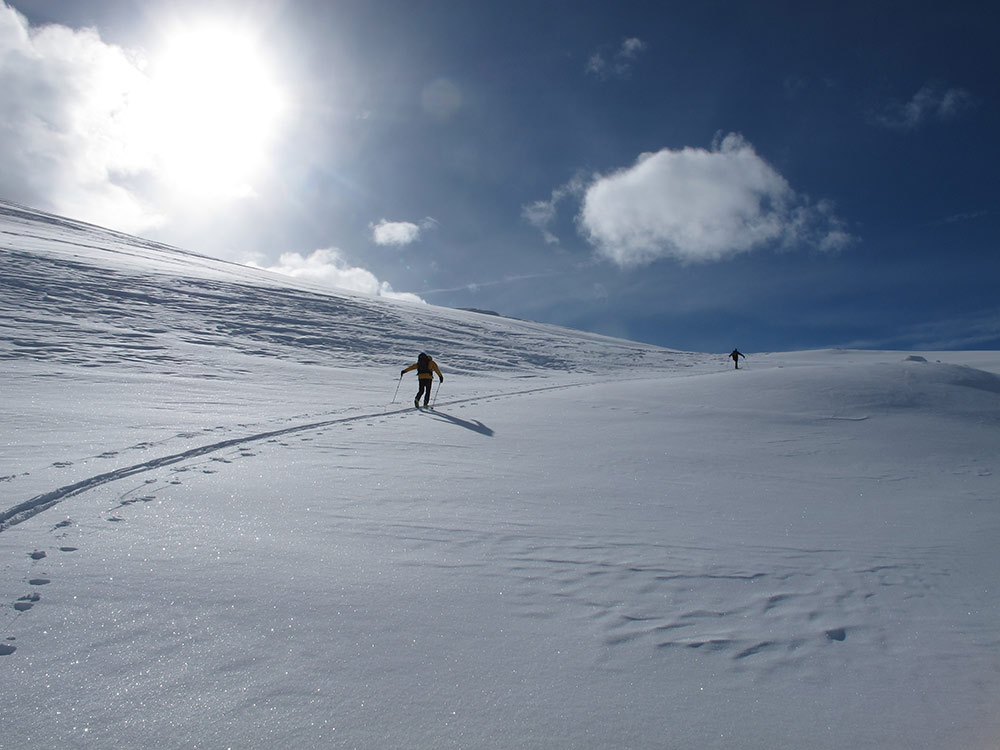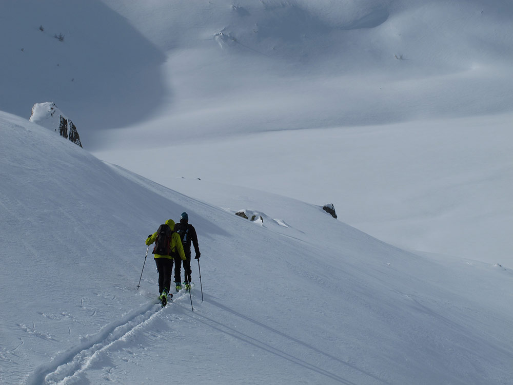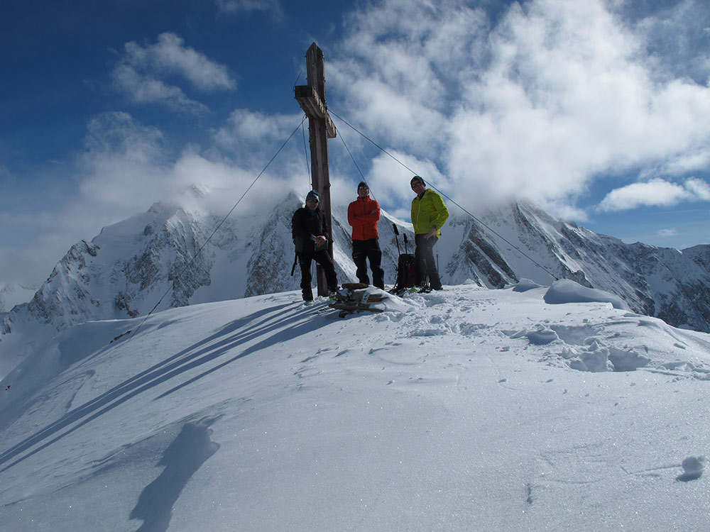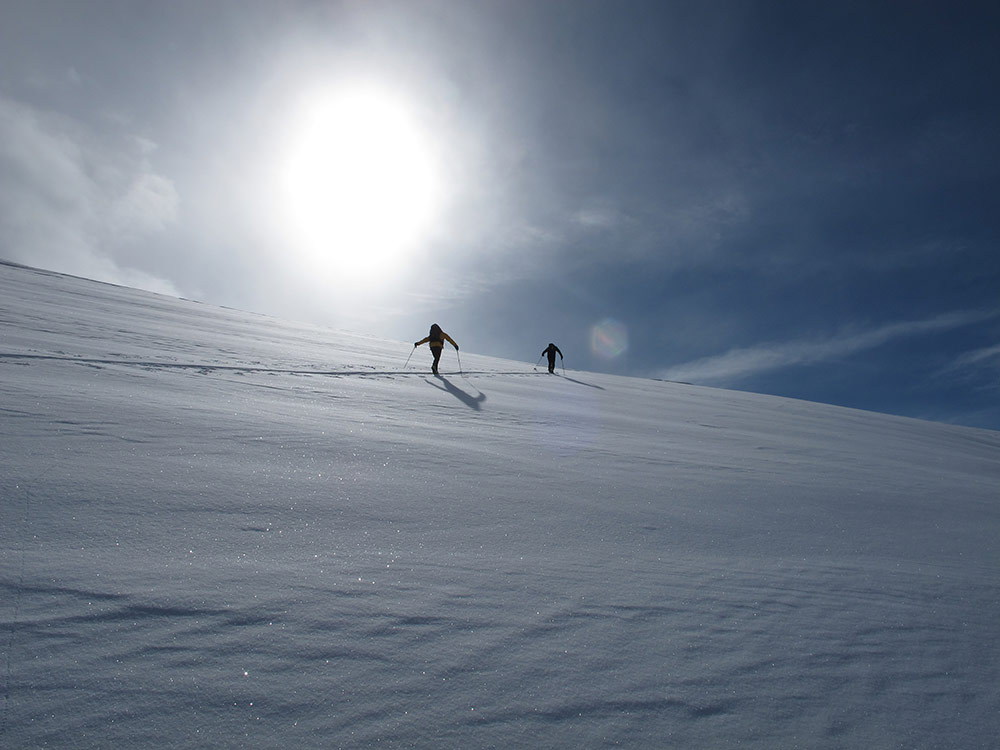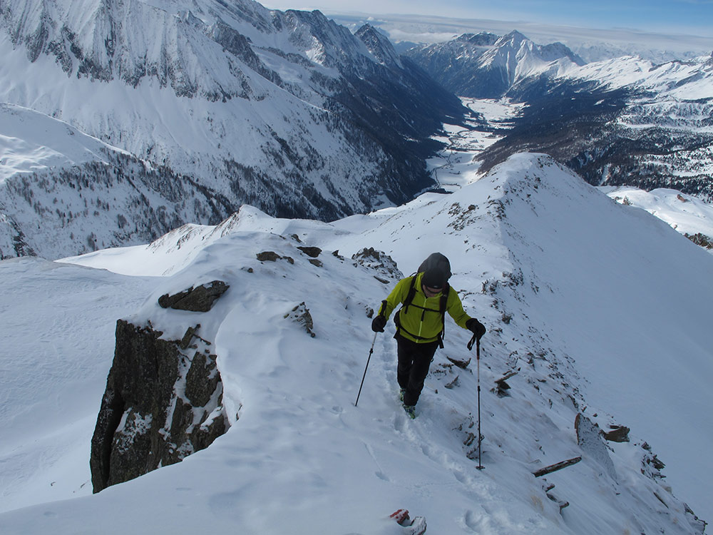 Auf dem selben Weg über den Grat zurück, oder bei guten Verhältnissen über die sehr steilen Gipfelhänge!