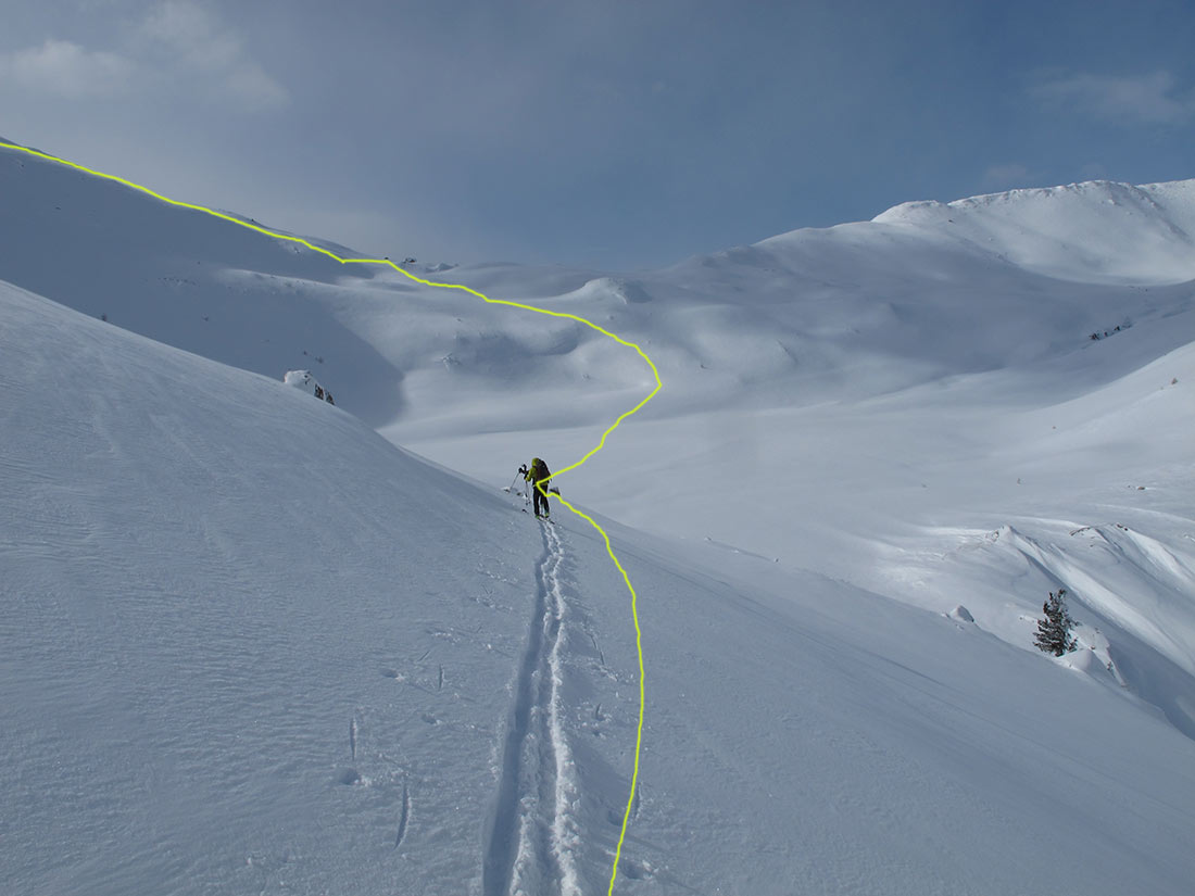 2. Man steigt direkt hinter der Lafitz Alm links über sehr steile Hänge auf, deutlich kürzere Variante aber nur bei sicheren Verhältnissen machbar. Auch hier gelangt man direkt unter den Gipfelhang.
