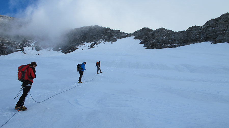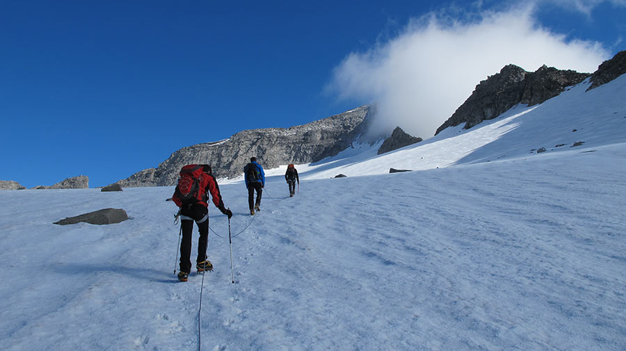 Zu Beginn eher mittig über den Gletscher, auf Höhe der Oberschrammachscharte über mässig steiles Gelände in Richtung Südgrat (ca. 1,5 Stunden), der Einstieg befindet sich nicht bei der Scharte, sondern am tiefsten Punkt nach dem markanten Felskopf der sich aus der Scharte erhebt. Kurzer, steiler Firn-, Eisaufschwung bis wenige Meter unter die Gratschneide.