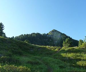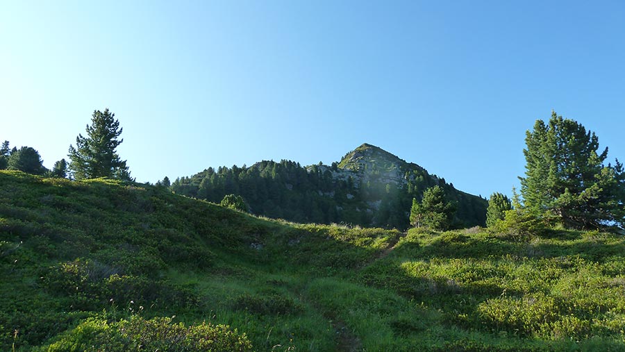 An der Hütte vorbei und über den steilen Grashang mittig aufsteigen bis man zur oberen Harpfneralm kommt (Materialseilbahn).