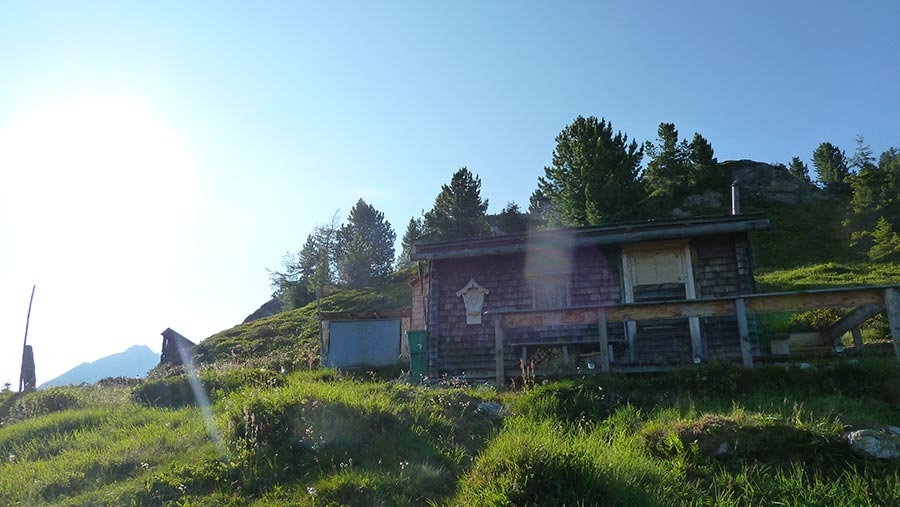 Auf ca. 2000m kommt man zur Ahornachalm, an den ersten zwei Hütten vorbei und bei der dritten und letzten Hütte direkt über die Terrasse zum Jägersteig.