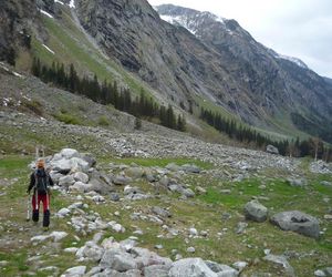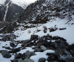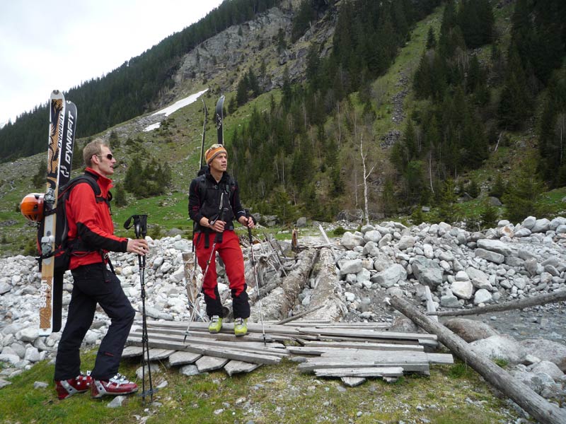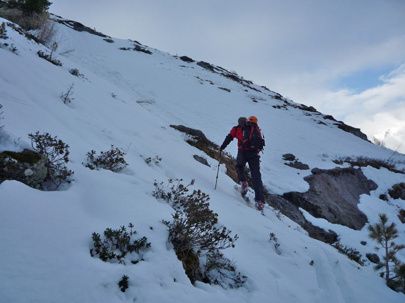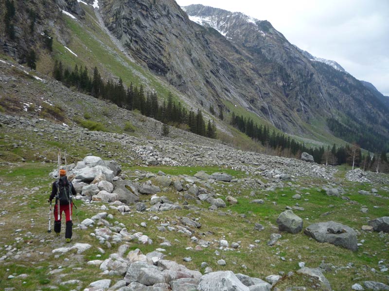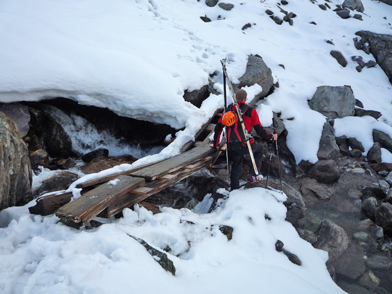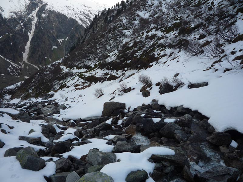 Etwa 500m hinter der Hütte über eine Brücke und auf die andere Talseite. Leicht steigend, rechts vorbei an der verfallenen Stapfenalm, bis in den hintersten Talgrund und steil in der ersten breiten Rinne hinauf.