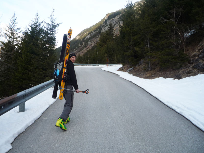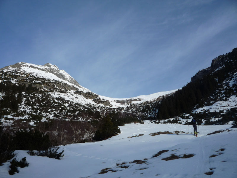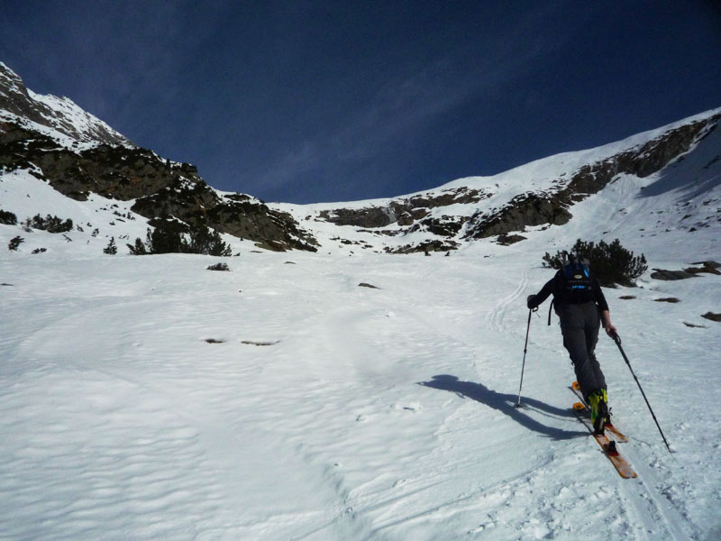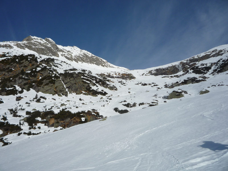Direkt nach der Galerie kann man die Schi anschnallen und steigt über das untere Bärenbadkar auf, es muss ein kurzer Latschengürtel überwunden werden, anschliessend folgt ein flacher Karboden bis man zu einer sehr steilen Rinne unterhalb des Aukaregg  gelangt die ins obere Bärenbadkar leitet.