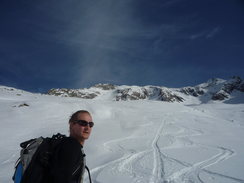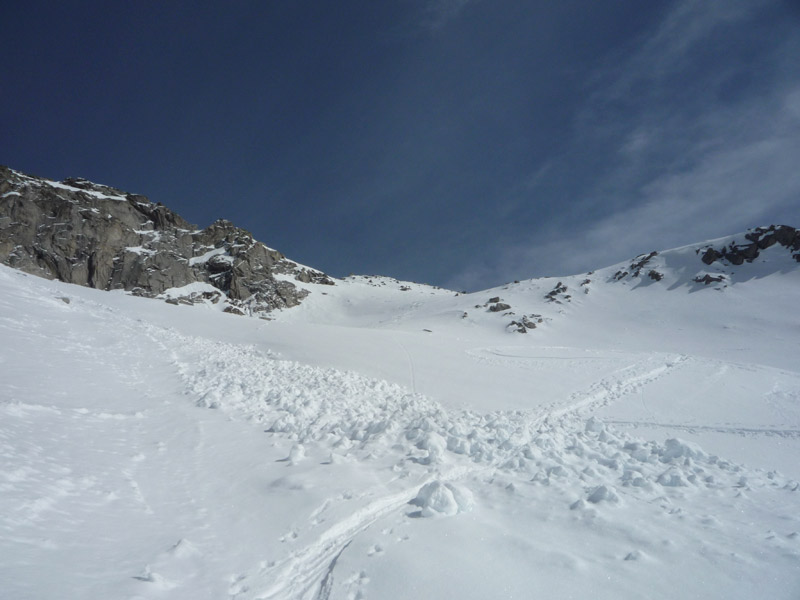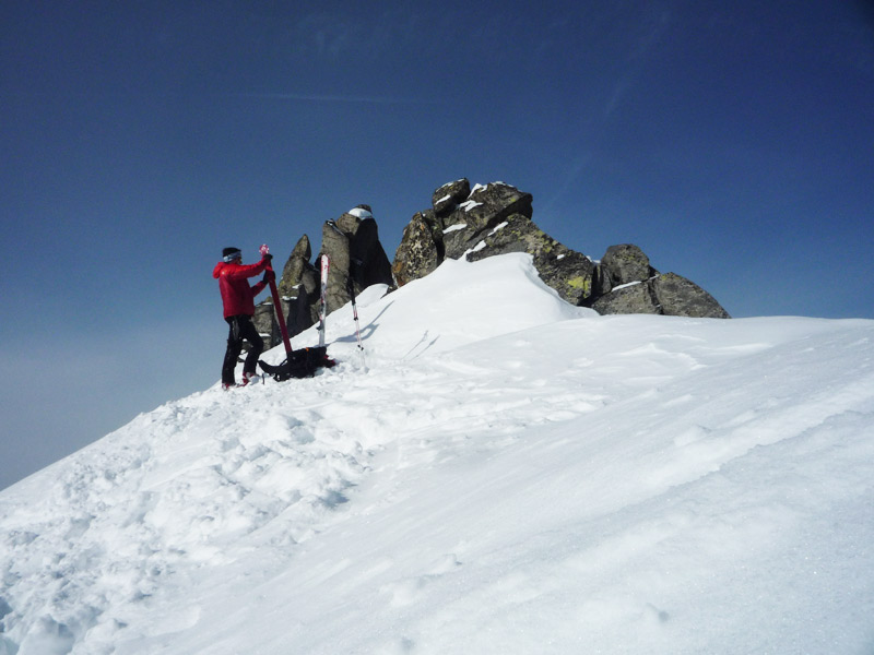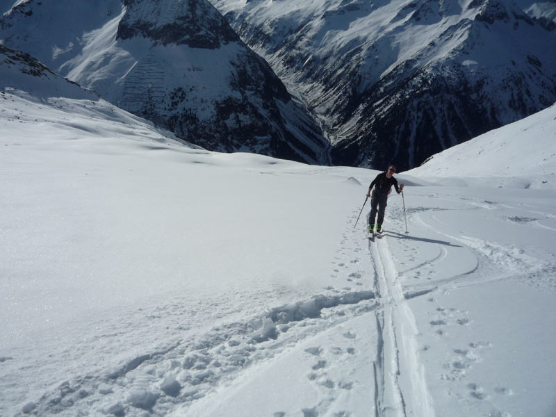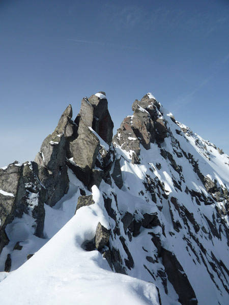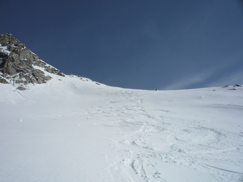 Am Ende des Hangs steigt man rechts unterhalb des Gipfels auf die Scharte auf (Schidepot), eine Besteigung des Gipfels über den Ostgrat ist nicht zu empfehlen!