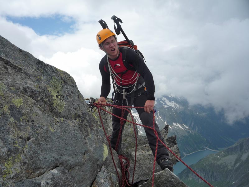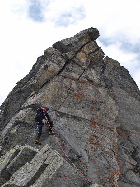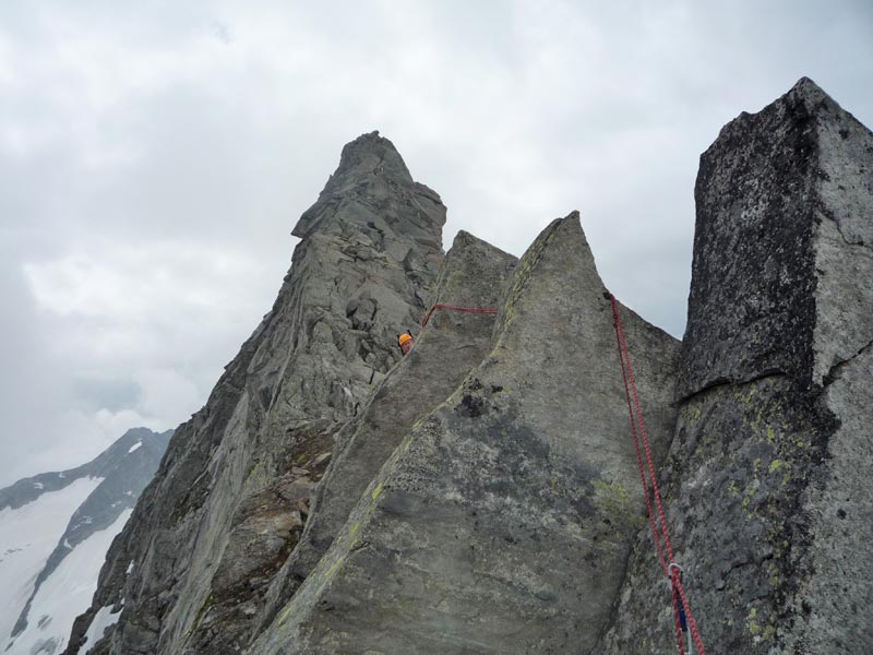 Am ersten großen Turm beginnt die Kletterei. Den Turm umgeht man auf der rechten Seite, nach wenigen Metern befindet man sich auch schon in der Schlüsselseillänge wo eine kurze, steile Wand mit einem gutgriffigen Riss, (IV, 1 Haken) sich ca 6m empor zieht. Es folgen einige sehr ausgesetzte Seillängen direkt über die spitzigen Gratzacken. Angelangt an der grossen Scharte muss man ca 2 Meter abklettern und gelangt über eine kurze Querung zu einer Verschneidung mit fingerbreitem Riss und glatter Platte. Hat man diese Stelle überwunden folgen wunderschöne Seillägen im II und III Grad bis zum Gipfel.