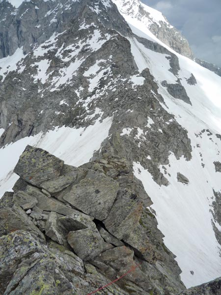 Weiter gehts direkt in der Scharte immer dem Stahlseil nach einmal links einmal rechts. Das Stahlseil ist in diesem extrem Brüchigen und teilweise vereistem Gelände eine erfreuliche Hilfe.