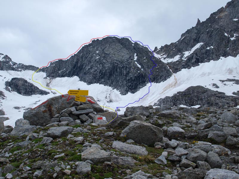 Hier folgt man dem Weg in Richtung Reichenspitze bis zum Wegweiserschild der die Abzweigung zur Richterspitze markiert. Über das Kuchelmooskar in Richtung Richterspitze aufsteigen, hier verlässt man den Normalweg zur Gamsscharte und steigt links von der Richterspitze über einen steilen Firnhang auf bis zur Richterscharte auf ca 3000m die sich zwischen Zillerspitze und Richterspitze befindet.