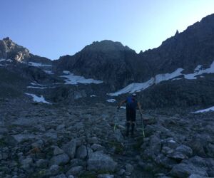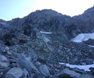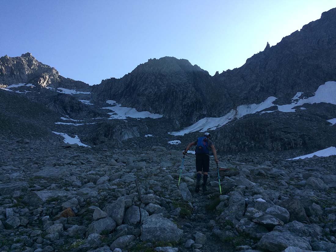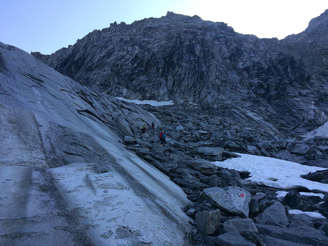Hier folgt man dem Weg in Richtung Reichenspitze bis zum Wegweiserschild der die Abzweigung zur Richterspitze markiert. Dem Weg folgen bis zum Wandfuss, Einstieg auf ca 2750m (ca 1 Stunde von Hütte)