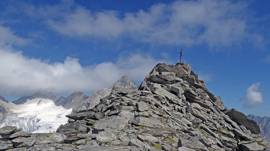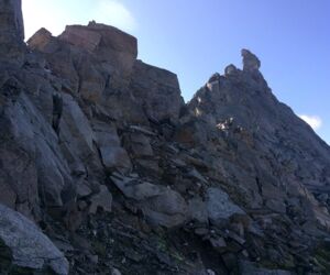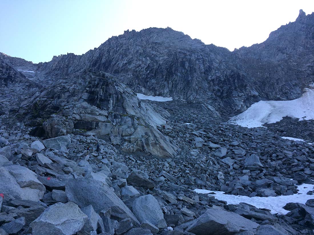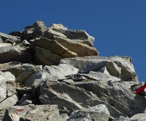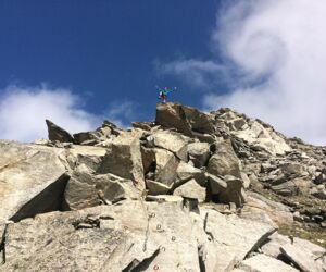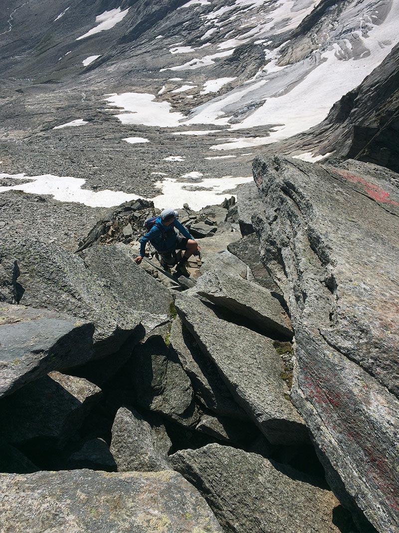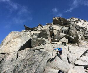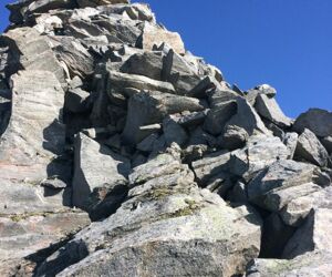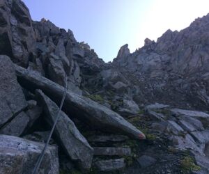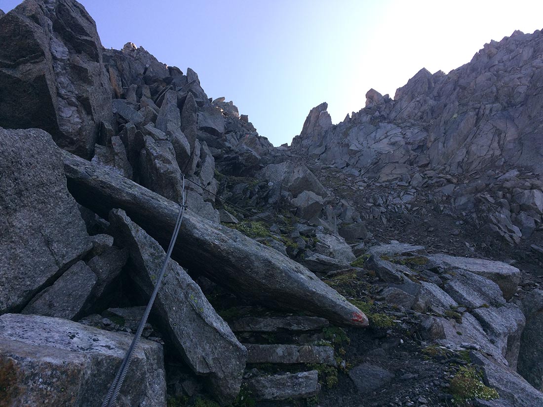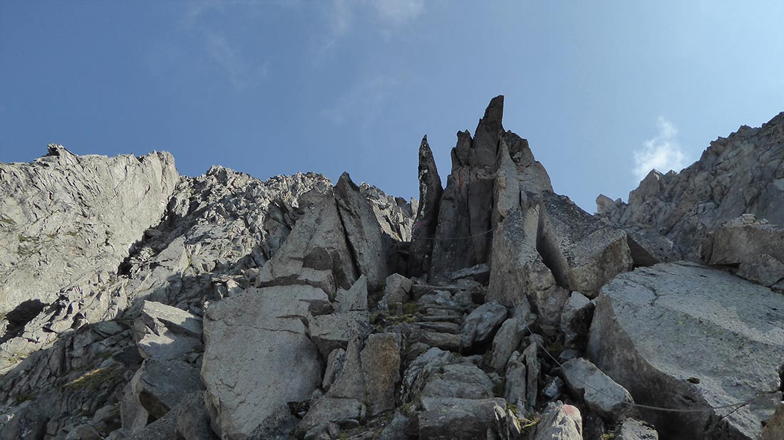 Ab hier noch ein kurzer Aufschwung der Seilversichert ist (Schlüsselstelle C) anschliessend in einfacher Blockkletterei meist im I Schwierigkeitsgrat auf den Gipfel (1 bis 2 Stellen vielleicht II)