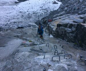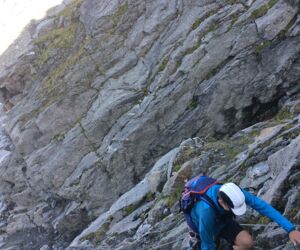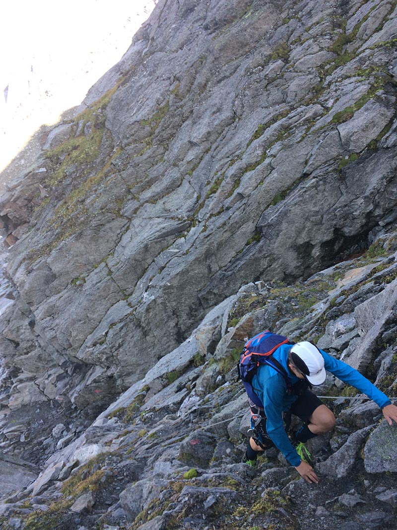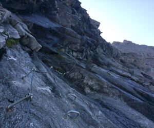 Über den neu errichteten und sehr gut versicherten Klettersteig erst über Wand dann über Schrofengelände bis zur Scharte die der Übergang zur Richterhütte ist. (Meist B Stellen C)